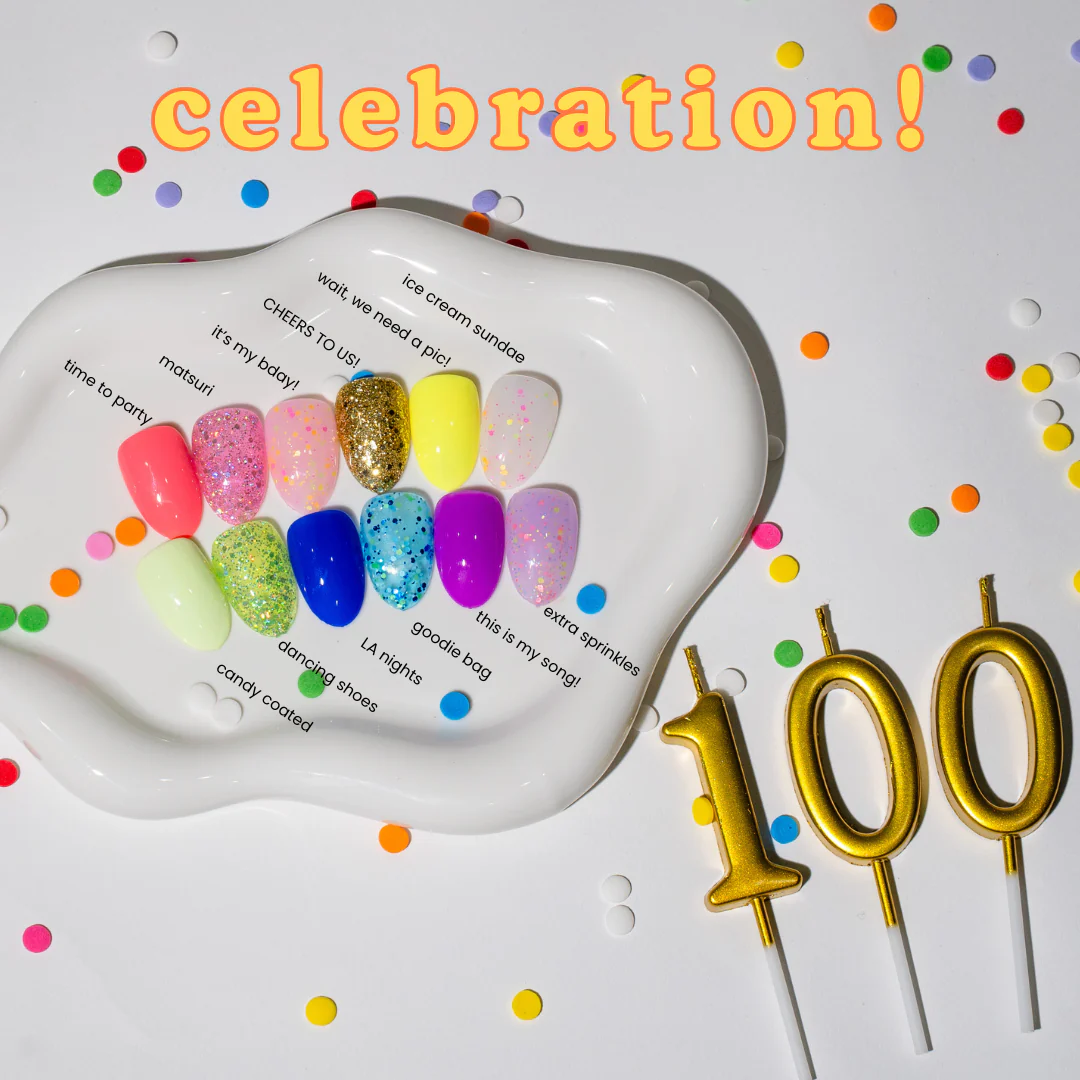For the last 6 years you all have supported the Nail Thoughts line in a way we could have never imagined. As a thank you, Katie decided to bring you all a confetti glitter party of a collection to celebrate! This collection is filled with creamy almost-neon colors with complementary confetti and glitters that offer so many cute layering options. And of course they are all centered around the official 100th Nail Thoughts color “Cheers to us!” which is the first gold glitter in the NT line. So come celebrate with us, because it’s Time to Party!